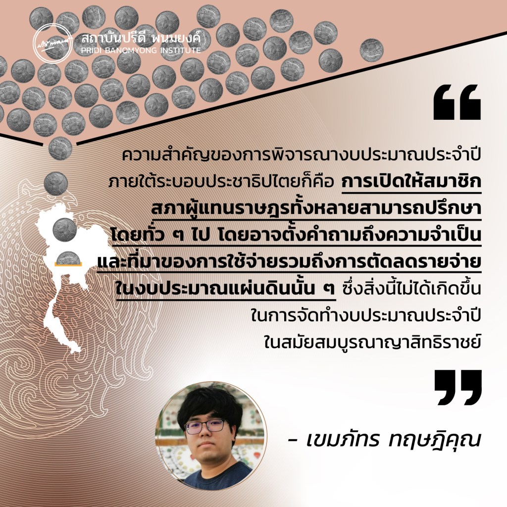 อีกทั้งรัฐธรรมนูญแห่งราชอาณาจักรไทย พุทธศักราช 2560 พยายามควบคุมไม่ให้สมาชิกสภาผู้แทนราษฎรเข้าไปมีส่วนเกี่ยวข้องในกระบวนการงบประมาณ อาทิ การห้ามไม่ให้แปรญัตติที่มีลักษณะเป็นการเพิ่มเติมงบประมาณในเรื่องที่มีส่วนได้เสีย ซึ่งเดิมใช้เฉพาะกับการแปรญัตติในการผันงบไปลงพื้นที่ตามรูปแบบของงบพัฒนาจังหวัด หรือการเข้าไปมีส่วนเกี่ยวข้องหรือตัดสินใจงบประมาณในหน่วยงานของรัฐ[19] บทบัญญัติในลักษณะดังกล่าวจะกลายเป็นการกีดกันไม่ให้ฝ่ายนิติบัญญัติสามารถเข้าไปใช้ช่องทางเพื่อควบคุมหรือตรวจสอบการตัดสินใจในทางงบประมาณได้ โดยฝ่ายนิติบัญญัติทำได้เพียงแต่การตั้งข้อสังเกตเกี่ยวกับการใช้งบประมาณเพื่อให้ฝ่ายบริหารนำไปใช้